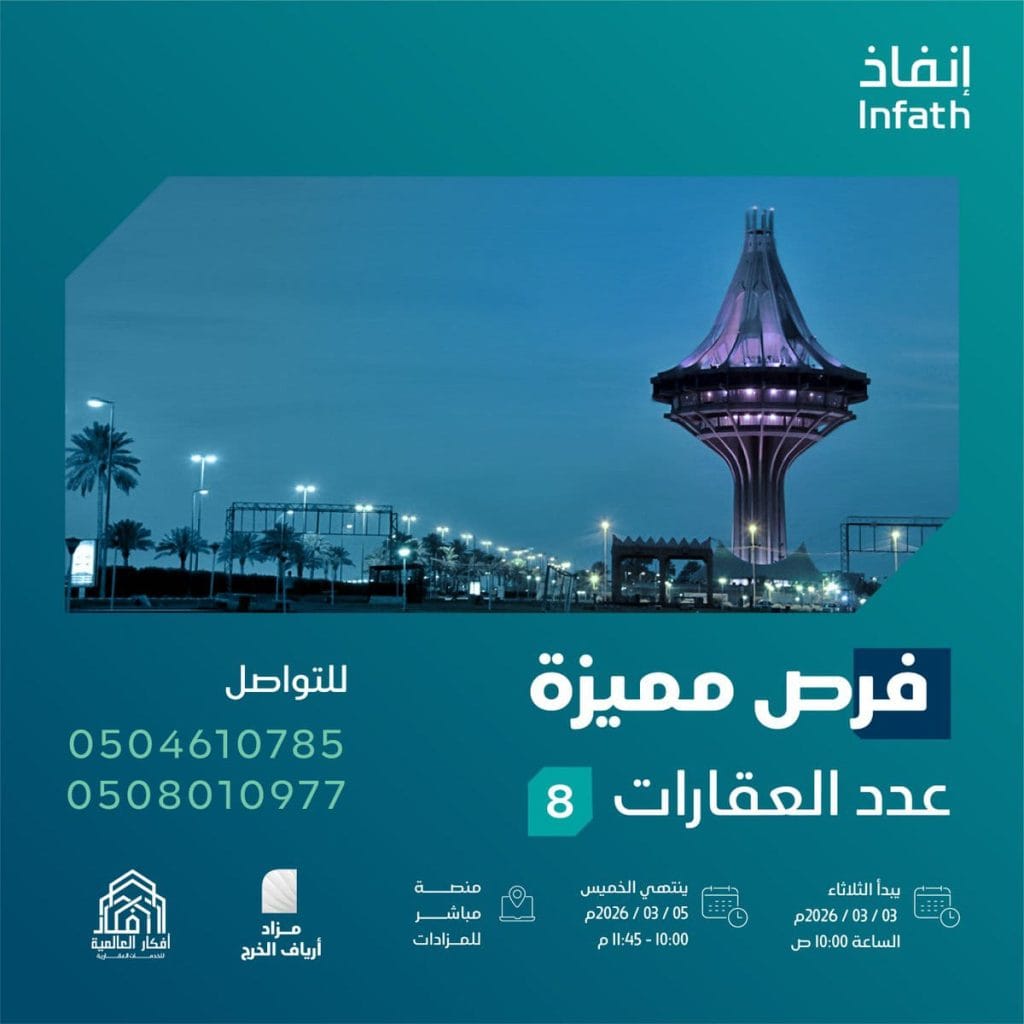 أعلنت مؤسسة أفكار العالمية للخدمات العقارية، وتحت إشراف مركز الإسناد والتصفية «إنفاذ» وبقرار من محكمة التنفيذ، عن طرح مزاد «أرياف الخرج» الإلكتروني. يبدأ المزاد يوم الثلاثاء 3 مارس 2026م، في تمام الساعة 10:00 صباحاً، وينتهي يوم الخميس 5 مارس 2026م، ما بين الساعة 10:00 إلى 11:45مساءً.