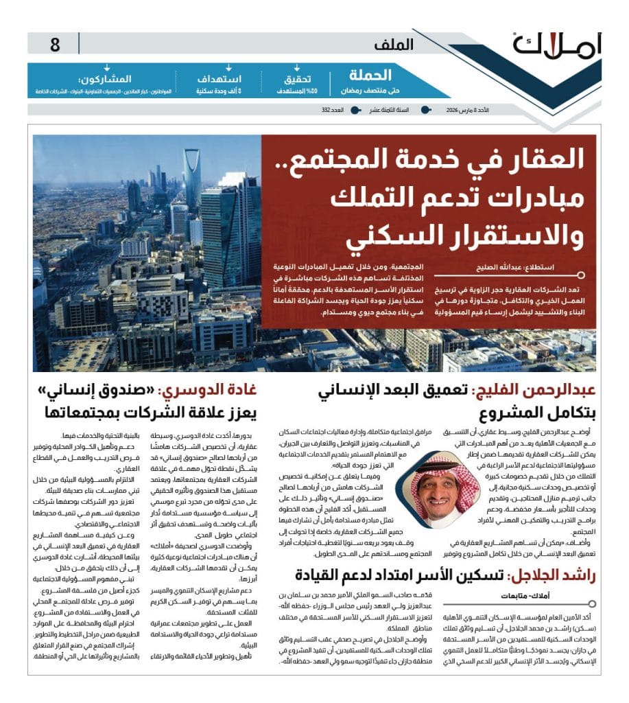 تعد الشركات العقارية حجر الزاوية في ترسيخ العمل الخيري والتكافل، متجاوزةً دورها في البناء والتشييد ليشمل إرساء قيم المسؤولية المجتمعية، ومن خلال تفعيل المبادرات النوعية المختلفة تساهم هذه الشركات مباشرة في استقرار الأسر المستهدفة بالدعم، محققةً أماناً سكنياً يعزز جودة الحياة ويجسد الشراكة الفاعلة في بناء مجتمع حيوي ومستدام.