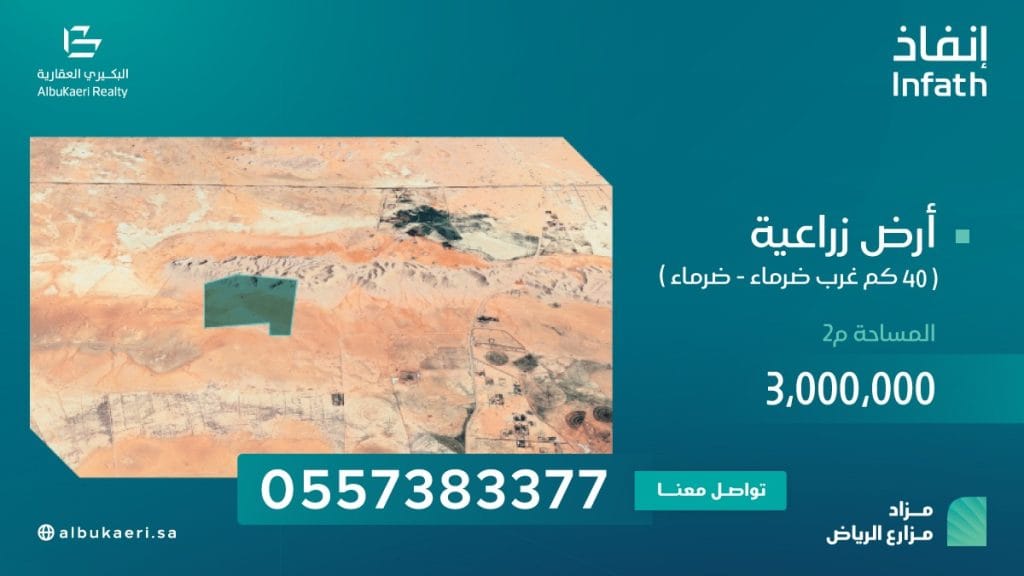 يطرح المزاد 02 فرص عقارية مميزة في مواقع استراتيجية في مدينتي ضرماء والمزاحمية. يتكون العقار الأول من أرض زراعية بمساحة 3,000,000 متر مربع في مدينة ضرماء ، والعقار الثاني من أرض زراعية بمساحة 2,000 متر مربع في مدينة المزاحمية.