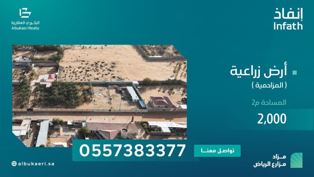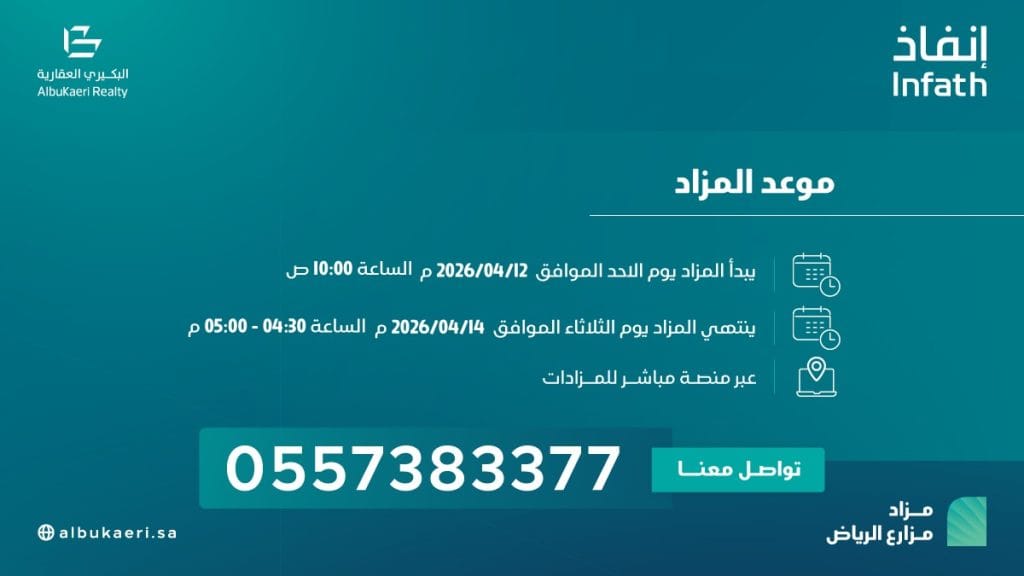 تعلن شركة/البكيري للمزادات العقارية وبإشراف مركز الإسناد والتصفية «إنفاذ» وبقرار من محكمة التنفيذ وحكم من محكمة الأحوال الشخصية، عن إقامة مزاد «مزارع الرياض» وذلك يوم 12/04/2026 بمدينة الرياض/ إلكترونيًا عبر منصة مباشر للمزادات من الساعة 04:30 حتى 05:00 مساء .