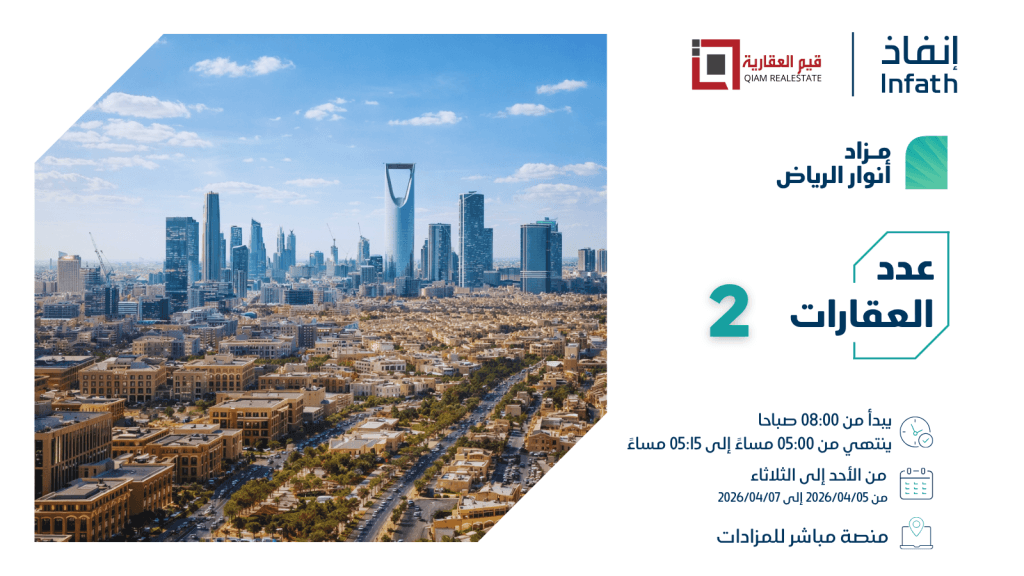تعلن شركة قيم العقارية وبإشراف مركز الإسناد والتصفية «إنفاذ» وبقرار من محكمة التنفيذ، عن إقامة مزاد «أنوار الرياض» إلكترونيًا وذلك يوم 5-4-2026 عبر منصة مباشر للمزادات في تمام الساعة 08:00 صباحاً وحتى تاريخ 7-4-2026 من الساعة 05:00 مساءً إلى الساعة 05:15 مساءً.