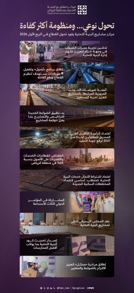 سجّل قطاع البنية التحتية في منطقة الرياض خلال الربع الأول من عام 2026 تحولًا نوعيًا في منظومته التنظيمية والتشغيلية، مدفوعًا بحزمة من السياسات والمبادرات النوعية التي أطلقها مركز مشاريع البنية التحتية، ضمن توجه إستراتيجي يستهدف رفع كفاءة التنفيذ، وتعزيز الحوكمة، والارتقاء بجودة الحياة في المنطقة.