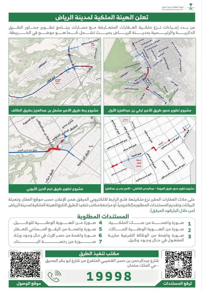 بدأت الهيئة الملكية لمدينة الرياض إجراءات نزع ملكية عدد من العقارات المتعارضة مع مسارات برنامج تطوير محاور الطرق الدائرية والرئيسية في العاصمة، ضمن خطط تهدف إلى تحسين البنية التحتية وتسهيل الحركة المرورية، ودعت الهيئة ملاك العقارات المشمولة بقرارات النزع إلى استكمال المستندات المطلوبة عبر القنوات الإلكترونية أو مراجعة مكتب تنفيذ الطرق التابع لها، لاستكمال الإجراءات النظامية المعتمدة.