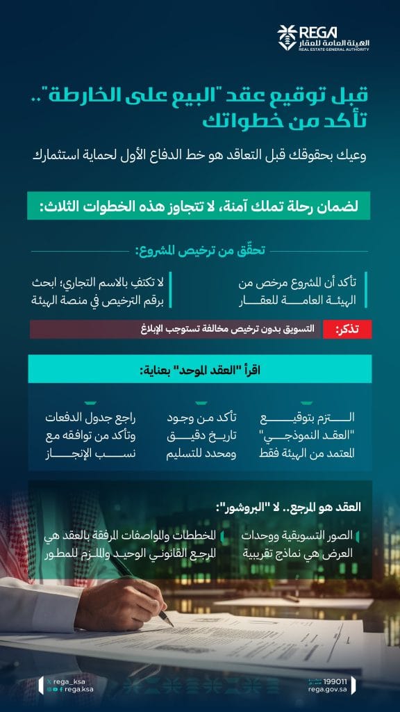 دعت الهيئة العامة للعقار إلى ضرورة التأكد من عدد من الخطوات الأساسية قبل توقيع عقد البيع على الخارطة، مشددة على أن وعي المشتري بحقوقه قبل التعاقد يمثل خط الدفاع الأول لحماية استثماره.