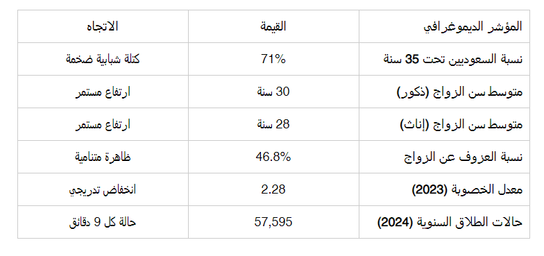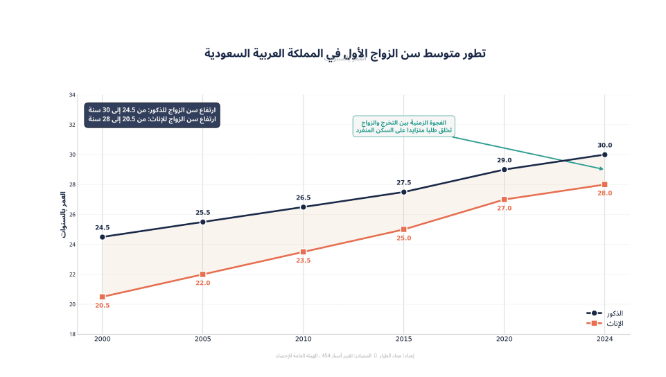 بالتوازي مع ذلك، يشهد المجتمع تأخراً ملحوظاً في سن الزواج. فقد ارتفع متوسط سن الزواج الأول إلى 28 عاماً للنساء و30 عاماً للرجال، مقارنة بـ 20.5 و24.5 على التوالي في مطلع الألفية . وتكشف دراسة أكاديمية حديثة أن نسبة العزوف عن الزواج بين الشباب السعودي بلغت 46.8%، وهي نسبة غير مسبوقة تاريخياً .