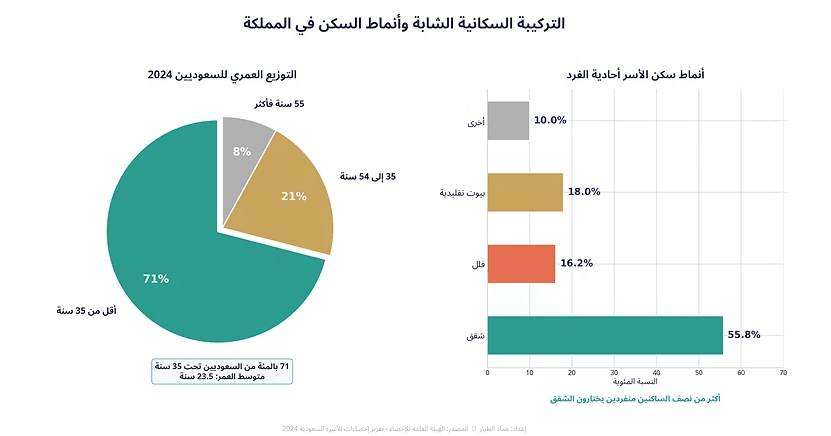 لفهم حجم هذا التحول، يجب النظر أولاً إلى التركيبة السكانية الشابة في المملكة. وفقاً لتقرير الهيئة العامة للإحصاء لعام 2024، يشكل الشباب تحت سن 35 عاماً نسبة 71% من إجمالي المواطنين السعوديين، بمتوسط عمر يبلغ 23.5 سنة فقط . هذه الكتلة الديموغرافية الضخمة تدخل سوق العمل وتتخذ قراراتها السكنية باستقلالية متزايدة، في مشهد مختلف تماماً عما عرفه جيل آبائهم.