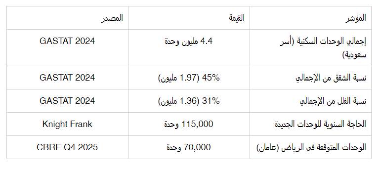 وفقاً لبيانات الهيئة العامة للإحصاء لعام 2024، بلغ إجمالي الوحدات السكنية المشغولة بأسر سعودية 4.4 مليون وحدة، بنمو 2.7% (أي 233,000 وحدة جديدة). ورغم أن الشقق تشكل 45% من هذا الإجمالي (1.97 مليون شقة)، إلا أن معظم هذه الشقق مصممة بمساحات كبيرة (3 إلى 4 غرف نوم) لتناسب العائلات، وليس الأفراد المستقلين .