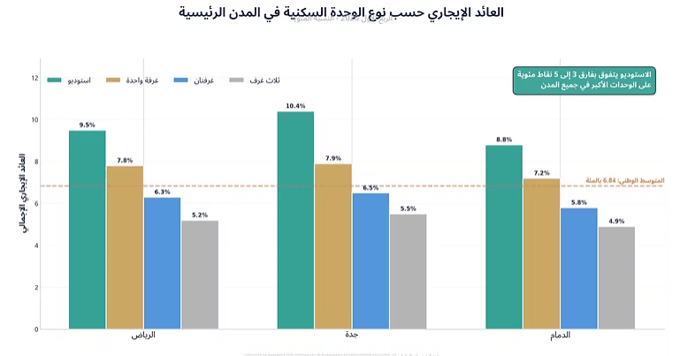 من منظور استثماري بحت، تثبت الأرقام أن الوحدات الصغيرة هي الأكثر جدوى في المشهد العقاري الحالي. في الربع الأول من عام 2026، بلغ متوسط العائد الإيجاري الإجمالي (Gross Rental Yield) في المملكة 6.84% .