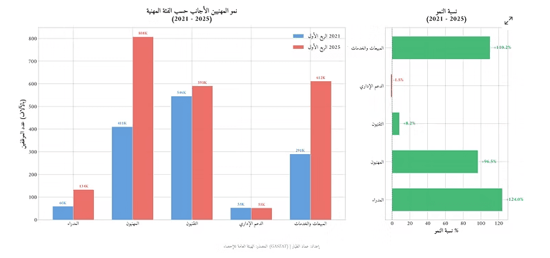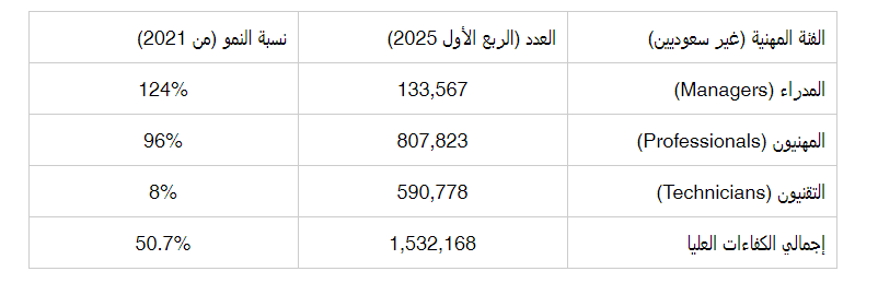 وفقاً لبيانات الهيئة العامة للإحصاء (GASTAT) للربع الأول من عام 2025، بلغ عدد المهنيين الأجانب في الفئات العليا (مدراء، مهنيون، وتقنيون) أكثر من 1.53 مليون موظف، مسجلين نمواً استثنائياً بنسبة 50.7% مقارنة بعام 2021 . وإذا أضفنا فئات الدعم الإداري والمبيعات، فإن إجمالي هذه الشريحة يقارب 2.2 مليون موظف.