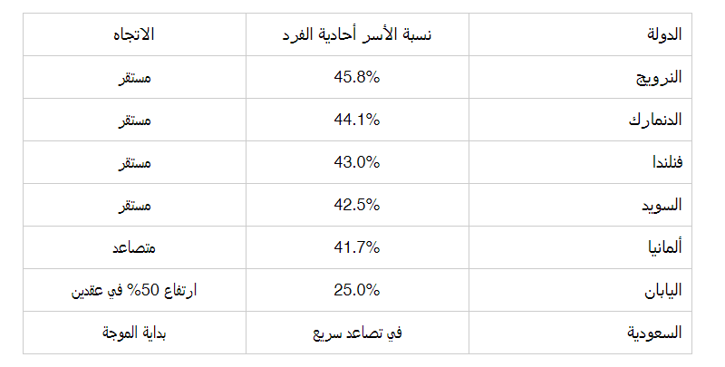 في الدول الاسكندنافية، تتجاوز نسبة الأسر أحادية الفرد 40% من إجمالي الأسر . وفي اليابان، ارتفعت هذه النسبة بنسبة 50% خلال العقدين الماضيين ، مما أدى إلى تحول جذري في سوق العقار نحو الوحدات المدمجة (Compact units) ومفهوم “المعيشة الذكية” (Smart living).