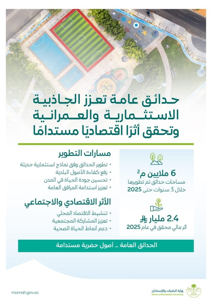 كشفت وزارة البلديات والإسكان عن تطوير نحو 6 ملايين م٢ من الحدائق العامة في مختلف مناطق المملكة خلال السنوات الثلاث الماضية حتى نهاية عام 2025، وذلك عبر نماذج استثمارية بالشراكة مع القطاع الخاص، أسهمت في تحقيق أثر مالي يقدّر بـ2.4 مليار ريال خلال عام 2025.