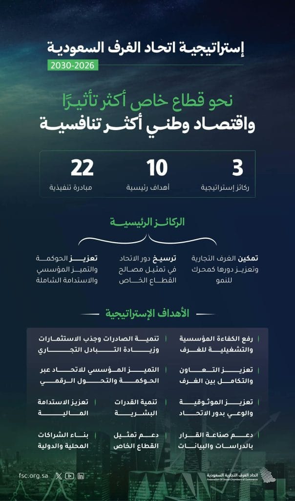 أطلق اتحاد الغرف التجارية السعودية استراتيجيته للفترة (2026–2030)، في خطوة نوعية تهدف إلى تعزيز تنافسية القطاع الخاص، ورفع كفاءة منظومة الأعمال، وترسيخ دور القطاع الخاص شريكًا رئيسيًا في تحقيق مستهدفات رؤية المملكة 2030.