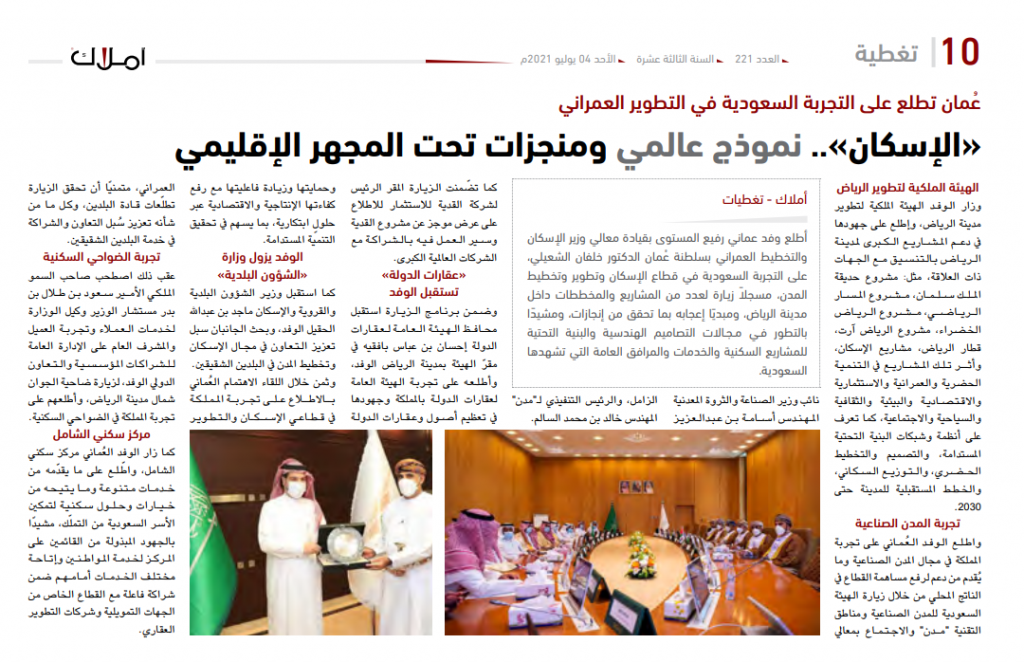 أطلع وفد عماني رفيع المستوى بقيادة معالي وزير الإسكان والتخطيط العمراني بسلطنة عُمان الدكتور خلفان الشعيلي، على التجربة السعودية في قطاع الإسكان وتطوير وتخطيط المدن، مسجلاً زيارة لعدد من المشاريع والمخططات داخل مدينة الرياض، ومبديًا إعجابه بما تحقق من إنجازات، ومشيدًا بالتطور في مجالات التصاميم الهندسية والبنية التحتية للمشاريع السكنية والخدمات والمرافق العامة التي تشهدها السعودية.