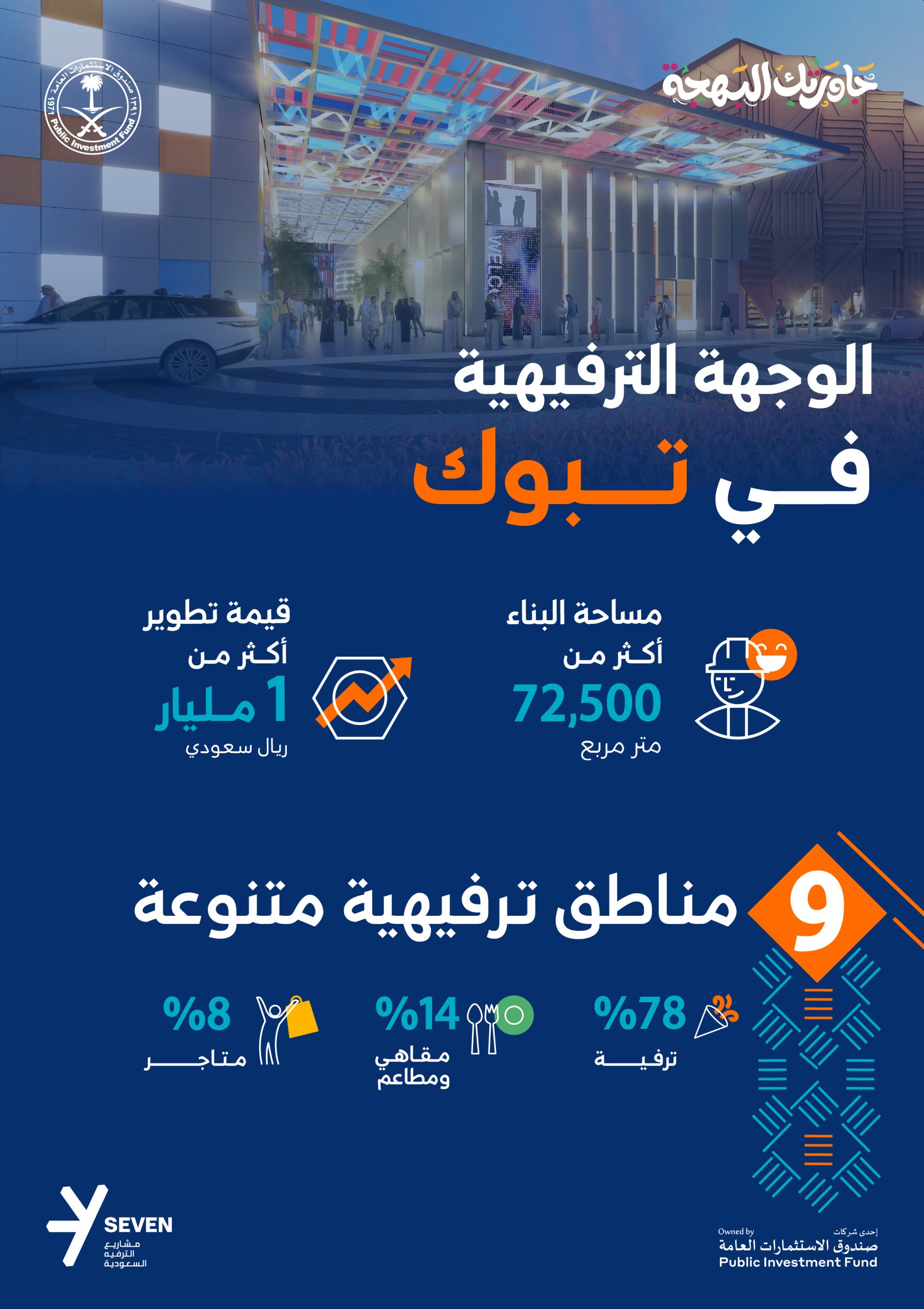 أعلنت شركة مشاريع الترفيه السعودية “سڤن”، المملوكة لصندوق الاستثمارات العامة، عن بدء الأعمال الإنشائية في وجهة ترفيهية جديدة بتبوك، التي تقع على مساحة تتجاوز الـ 40 ألف متر مربع، وبقيمة إجمالية تتجاوز المليار ريال. وفي حال الانتهاء من المشروع فإنه سيضم 72,500 متر مربع من مساحات البناء 78% منه للترفيه، و8% للمتاجر، و 14% للمقاهي والمطاعم، لتشكل إضافة نوعية للمشهد الترفيهي بالمنطقة، عبر توفير خيارات واسعة من معالم الترفيه والتجارب المميزة.