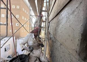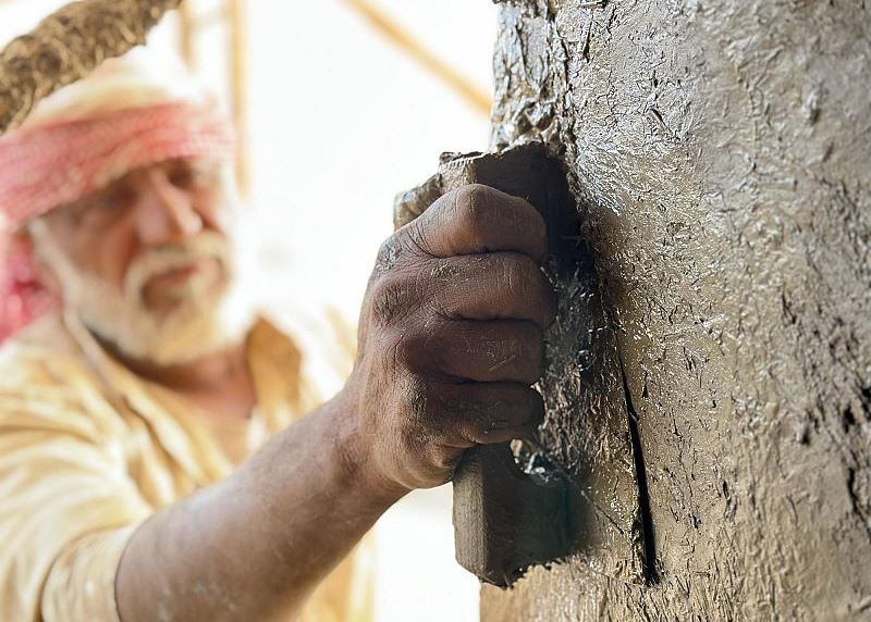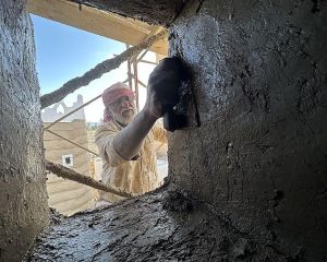 ووقفت وكالة الأنباء السعودية “واس” على عمليات الترميم التي تجري لعدد من البيوت والقصور الطينية التراثية بالمنطقة، حيث أوضح المتخصص في التراث الثقافي والعمراني النجراني ناصر مبارك الصقور كيفية بناء وترميم البيوت الطينية بدءاً بمكوناتها من الطين والتبن والخشب والحجر، بحيث يكون الحجر أساس البناء من الأسفل وبارتفاع لا يقل عن 10 سم للحفاظ على قوام الطين وحمايته من التحلل والتآكل “يأكله الملح”، ويكون العمل بالطين والتبن فهو على ثلاث مراحل وهي البناء مرحلتين و “الملاِّج” أو التلياس مرحلة واحدة.
