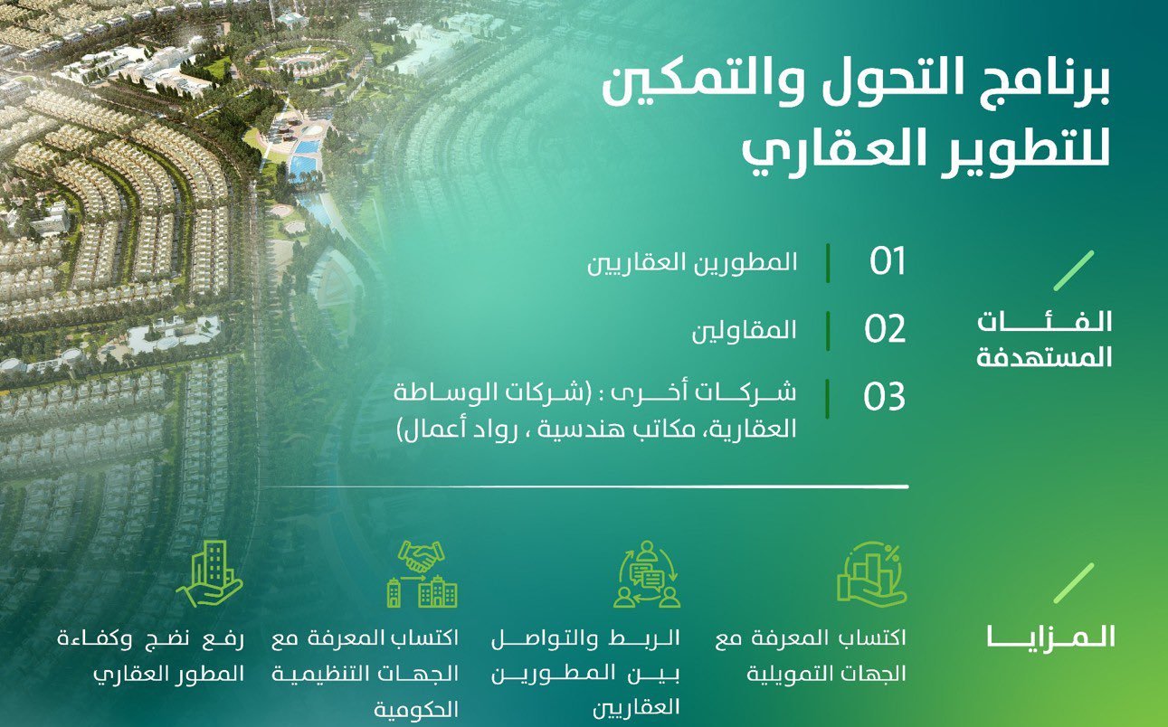وأطلقت وزارة البلديات والإسكان بالتعاون مع عدد من الجهات ذات العلاقة، برنامج “التحول والتمكين للتطوير العقاري“، والذي يستهدف المطورين العقاريين، والمقاولين، إلى جانب شركات الوساطة العقارية، والمكاتب الهندسية، ورواد الأعمال العاملين في القطاع العقاري.
