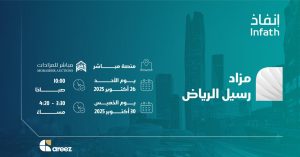 تعلن شركة أريز للاستثمار التجاري وبإشراف مركز الإسناد والتصفية «إنفاذ» وبقرار من محكمة التنفيذ، عن إقامة مزاد «رسيل الرياض»، وذلك يوم الأحد 26 أكتوبر 2025 في العاشرة صباحًا، وينتهي يوم الخميس 30 أكتوبر 2025 في الساعة الثالثة والنصف وحتى الرابعة وعشرون دقيقة مساءً، إلكترونيًا عبر منصة مباشر للمزادات.