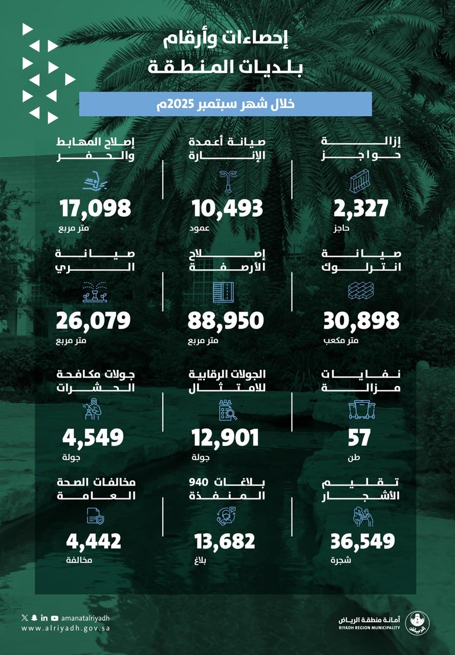 نفذت بلديات منطقة الرياض التابعة لأمانة منطقة الرياض، أعمالًا ميدانية خلال شهر سبتمبر 2025، شملت تنفيذ صيانة شوارع وأرصفة وإنارة وحدائق وأعمال نظافة وامتثال، ضمن جهودها المستمرة لرفع كفاءة البنية التحتية وتحسين جودة الخدمات البلدية في مدن ومحافظات المنطقة.