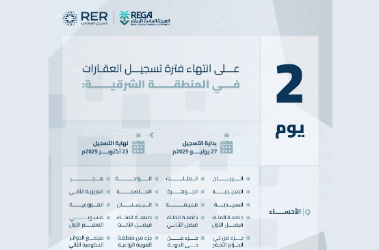 أعلنت الهيئة العامة للعقار عن قرب انتهاء المهلة المحددة للتسجيل العيني الأول للعقار لـ 14878 قطعة عقارية في محافظة الأحساء بالمنطقة الشرقية بنهاية يوم الخميس 1 جمادى الأول 1447هــ، الموافق 23 أكتوبر 2025م.