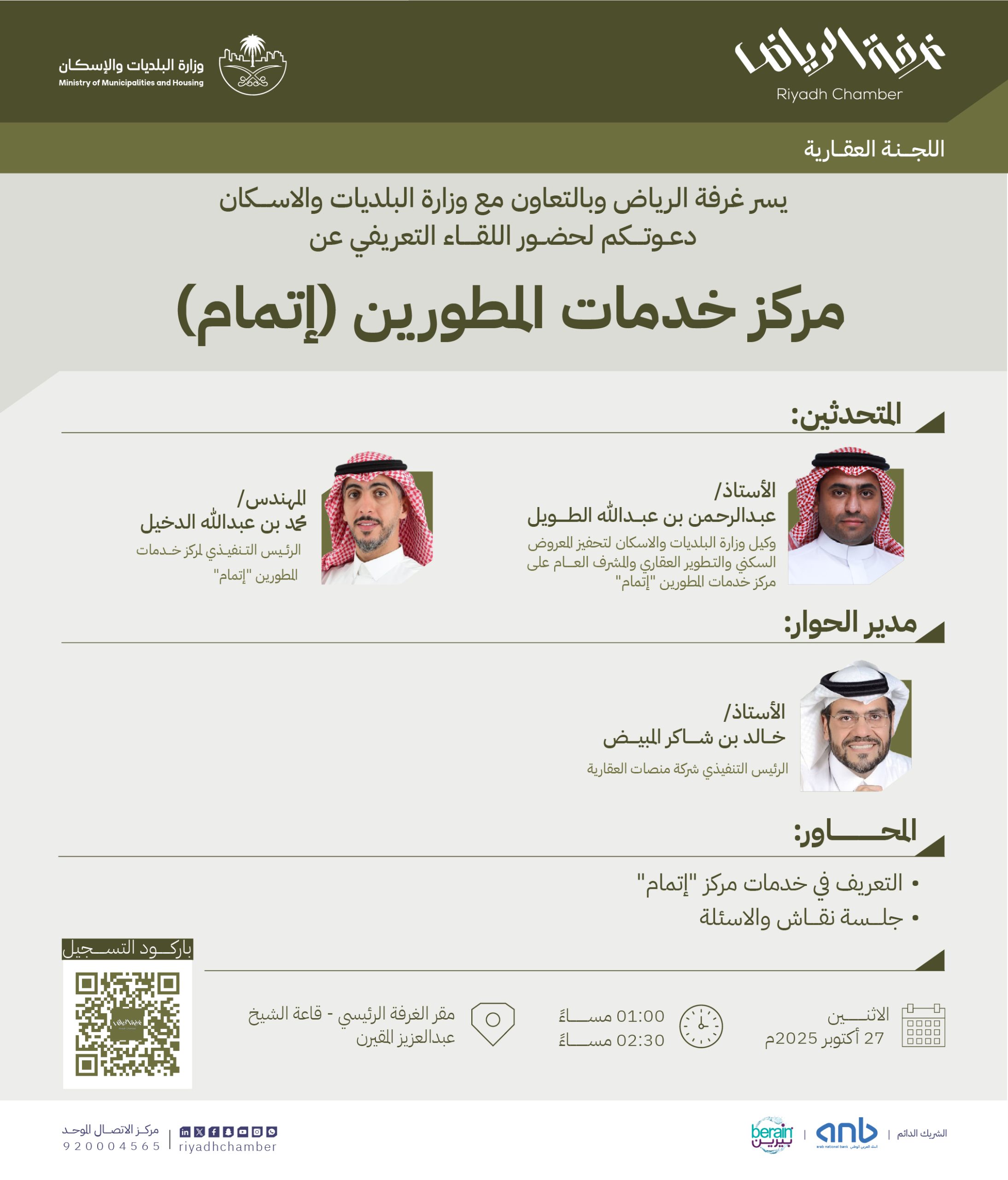 تنظم غرفة الرياض ممثلة في اللجنة العقارية، بالتعاون مع وزارة البلديات والإسكان، لقاءً تعريفياً حول مركز خدمات المطورين “إتمام”، وذلك يوم الاثنين 27 أكتوبر 2025 بمقر الغرفة الرئيسي – قاعة الشيخ عبدالعزيز المقيرن، من الساعة 1:00 ظهرًا حتى 2:30 ظهرًا.
