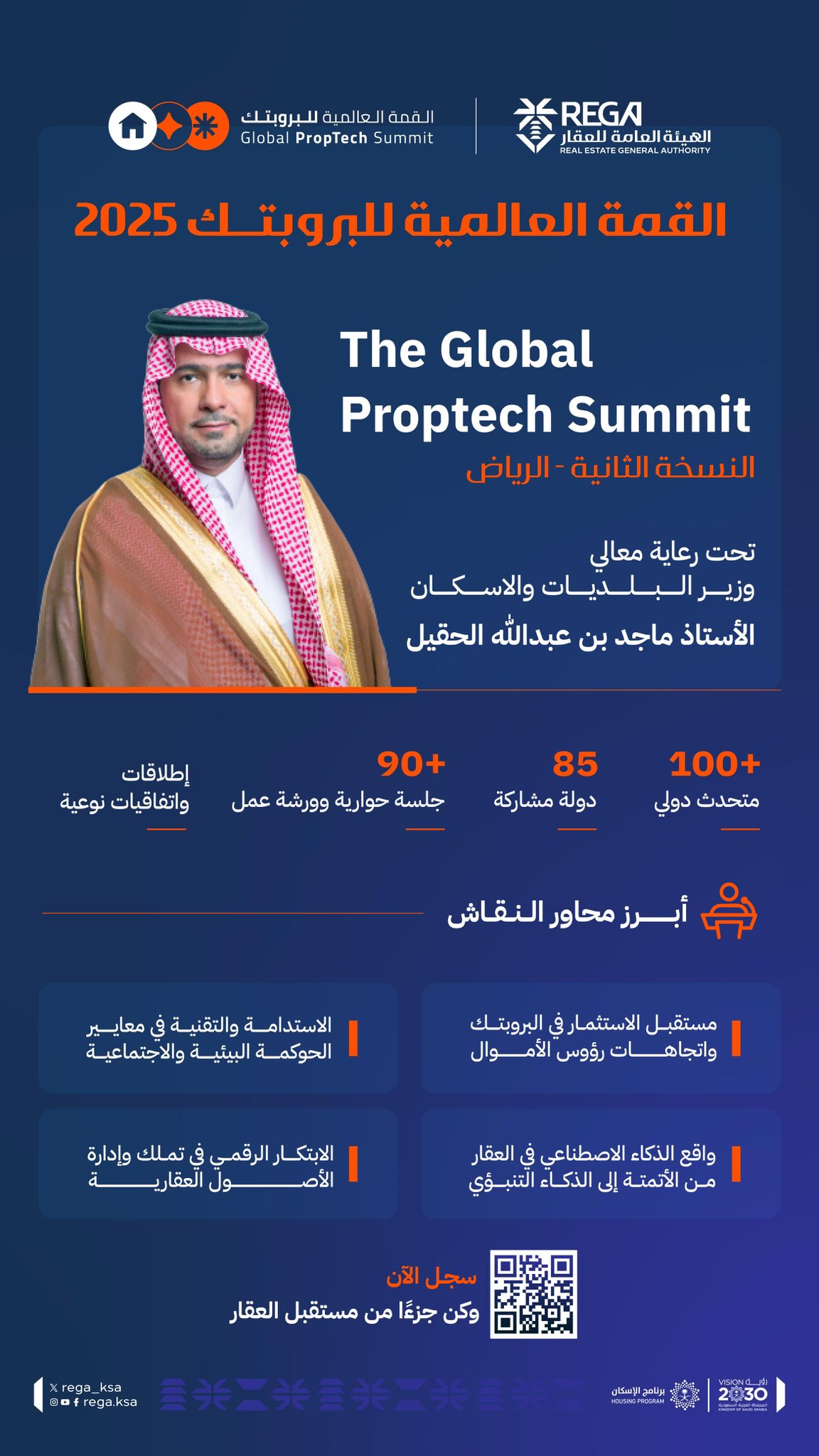 تنطلق اليوم الأحد في الرياض، أعمال القمة العالمية للبروبتك “The Global Proptech Summit”، التي تعقدها الهيئة العامة للعقار بشراكة إستراتيجية مع “NHC Innovation”، تحت شعار “الابتكار لمستقبل مستدام”، برعاية من معالي وزير البلديات والإسكان رئيس مجلس إدارة الهيئة العامة للعقار الأستاذ ماجد بن عبدالله الحقيل، ومشاركة عدد من المتخصصين في صناعة العقار والتقنيات العقارية، وأكثر من 100متحدثٍ يمثلون 85 دولة يشاركون تجاربهم وخبراتهم ووجهات النظر مع قادة الفكر، إلى جانب الرؤساء التنفيذيين لكبرى شركات العقار والتقنية العقارية والمستثمرين من مختلف أنحاء العالم.