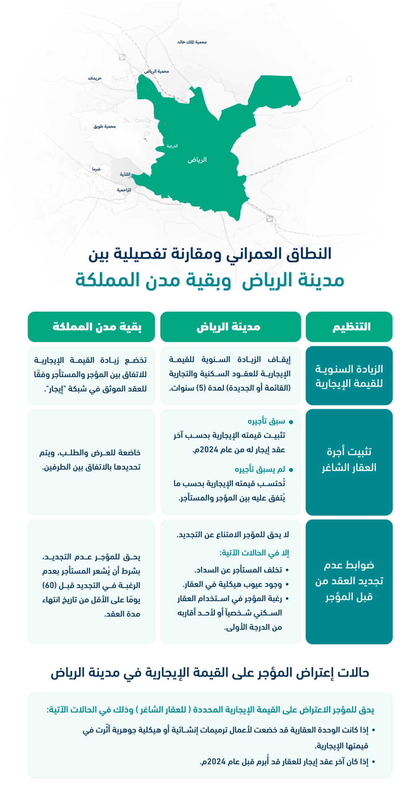 الإجابة: تحقيقًا لهدف استقرار السوق في العاصمة، نصت الأحكام التنظيمية على أنه لا يجوز للمؤجر زيادة القيمة الإيجارية للعقود السكنية والتجارية الواقعة ضمن النطاق العمراني المحدد لمدينة الرياض، وذلك لمدة خمس سنوات من تاريخ نفاذ الأحكام.