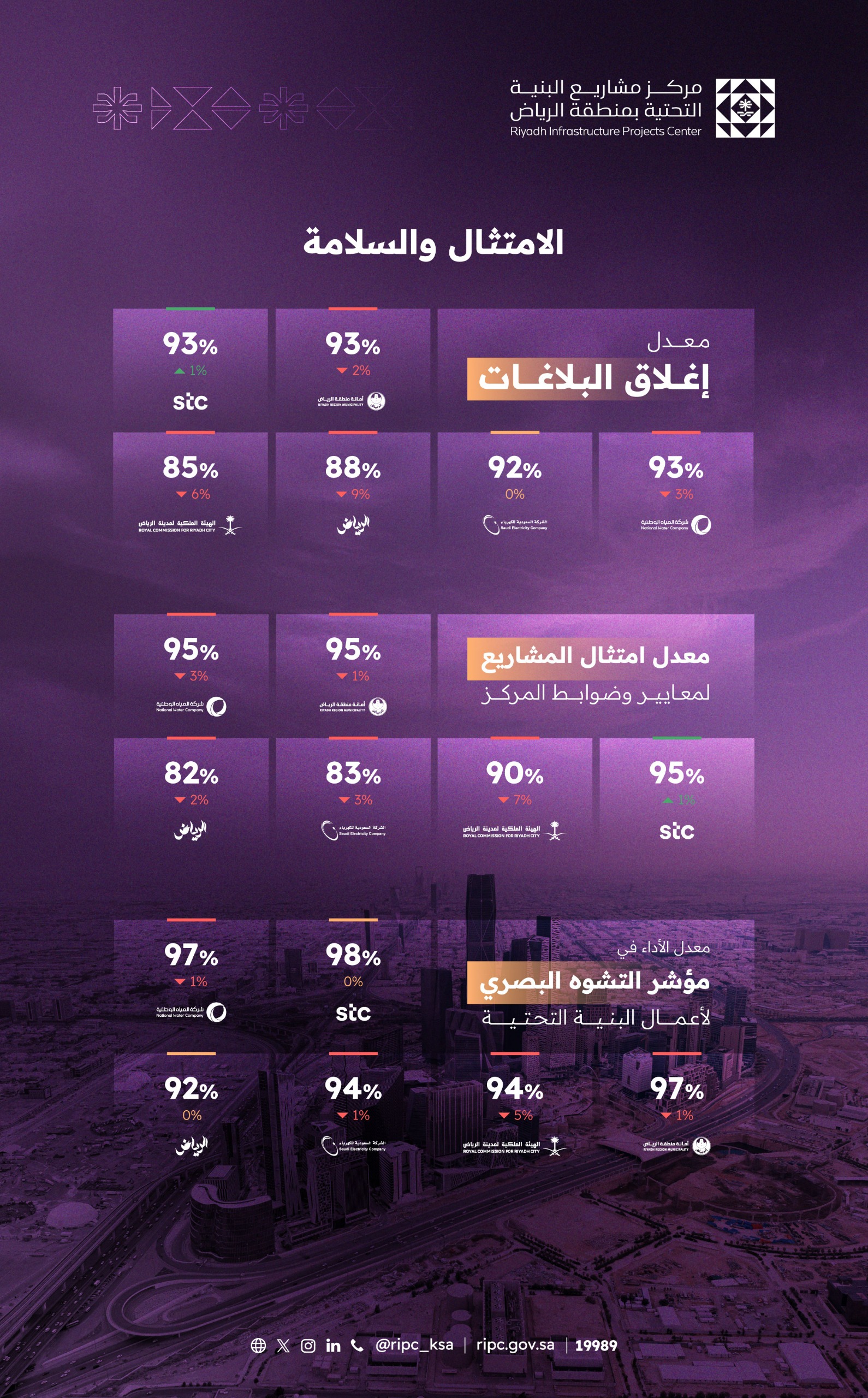 وأكد المركز أن نشر تقارير الأداء بشكل شهري يأتي ضمن ركائزه الإستراتيجية الهادفة إلى تحسين المشهد الحضري، ورفع كفاءة التنسيق بين الجهات، وتعزيز الامتثال للمعايير، وتوفير بيانات تشغيلية شفافة تمكّن الجهات من تحسين خطط التنفيذ ورفع كفاءة المشروعات، بما يسهم في دعم مستهدفات النمو والتطوير العمراني في مدينة الرياض وللاطلاع على تفاصيل التقرير يرجى الضغط على الرابط: https://report.ripc.gov.sa/share/report22.pdf.
