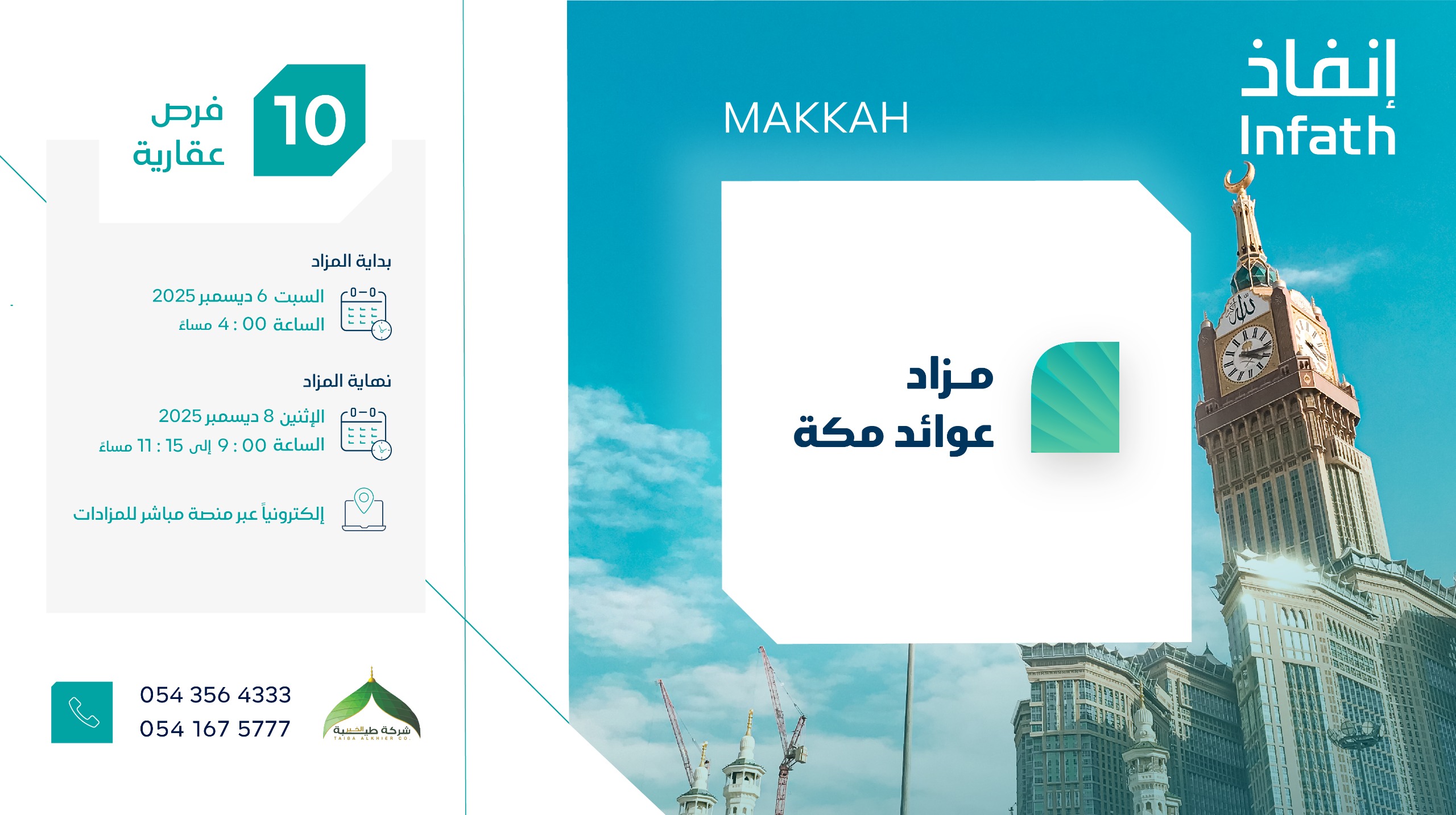 تعلن شركة طيبة الخير للمزادات وبإشراف مركز الإسناد والتصفية « إنفاذ » وبقرار من محكمة التنفيذ ومحكمة الأحوال الشخصية ، عن إقامة مزاد “عوائد مكة الإلكتروني” وذلك يوم السبت بتاريخ 06-12-2025م الساعة : 04:00 مساء حتى يوم الإثنين بتاريخ 08-12-2025م من الساعة: 09:00 مساء حتى الساعة : 11:15 مساء إلكترونيًا عبر منصة مباشر للمزادات .