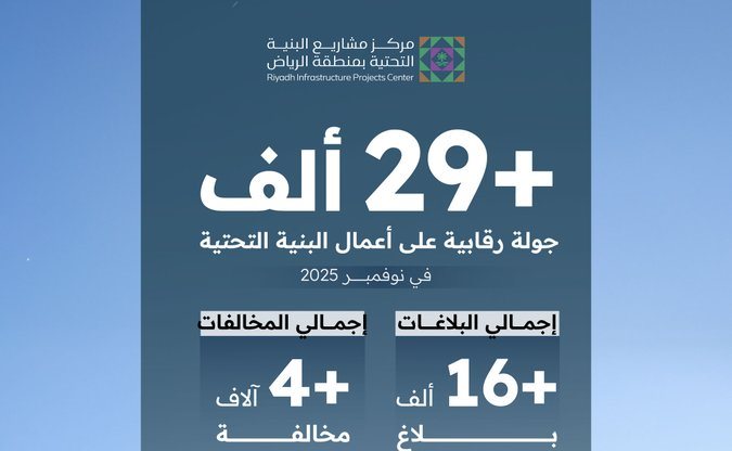 نفذ مركز مشاريع البنية التحتية بمنطقة الرياض خلال شهر نوفمبر 2025م، أكثر من 29 ألف جولة رقابية على أعمال مشاريع البنية التحتية في مدينة الرياض ومحافظات المنطقة؛ لمتابعة تنفيذ أعمال المشاريع وفق الاشتراطات الفنية، فيما استقبل أكثر من 16 ألف بلاغ لمخالفات في أعمال المشاريع.