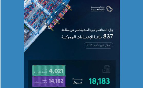 عالجت وزارة الصناعة والثروة المعدنية 837 طلبًا لخدمة الإعفاء الجمركي الصناعي خلال شهر أكتوبر 2025م، في إطار جهود الوزارة لتشجيع الصناعة المحلية وتعزيز تنافسيتها عالميًّا، عبر منح المنشآت الصناعية الوطنية إعفاءً من الرسوم الجمركية على وارداتها من مدخلات الصناعة.