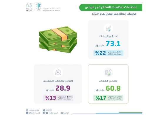 كشفت بيانات الهيئة العامة للإحصاء عن ارتفاع إيرادات القطاع غير الربحي لعام 2024م إلى (73.1) مليار ريال بنسبة نمو (22%) مقارنة بعام 2023م, فيما ارتفعت النفقات إلى (60.8) مليار ريال بنسبة نمو (17%)، وبلغت تعويضات المشتغلين (28.9) مليار ريال بزيادة قدرها (13%) عن عام 2023.