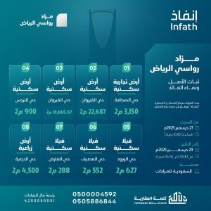 تعلن شركة تتمة العقارية وبإشراف مركز الإسناد والتصفية «إنفاذ» عن إقامة مزاد «رواسي الرياض» إلكترونياً وذلك يوم السبت 27 ديسمبر 2025 الموافق 7 رجب 1447هـ الساعة 10:00 صباحاً عبر منصة السعودية للمزادات.