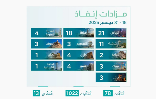 أشرف مركز الإسناد والتصفية (إنفاذ) على (78) مزادًا عقاريًا خلال الفترة من 15 إلى 31 ديسمبر 2025م، لبيع (1022) أصلًا عقاريًا متنوعًا تشمل العقارات السكنية والتجارية والزراعية، موزّعة على مختلف مناطق المملكة.