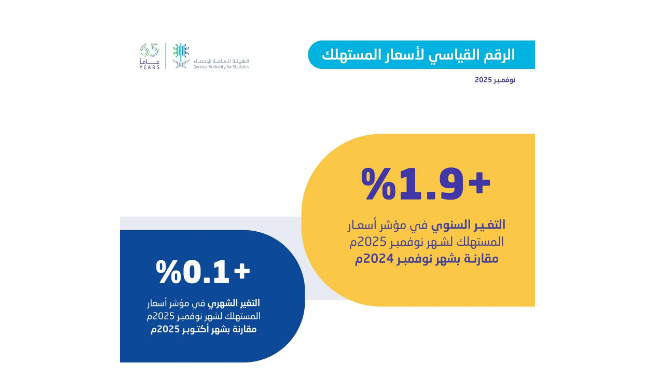 سجَّل معدل التضخم السنوي لمؤشر أسعار المستهلك في المملكة نسبة 1.9% خلال شهر نوفمبر 2025م مقارنة بنوفمبر 2024م في حين شهد المؤشر استقرارًا نسبيًا على أساس شهري بنسبة 0.1% مقارنة بشهر أكتوبر 2025م، وفق بيانات الهيئة العامة للإحصاء.