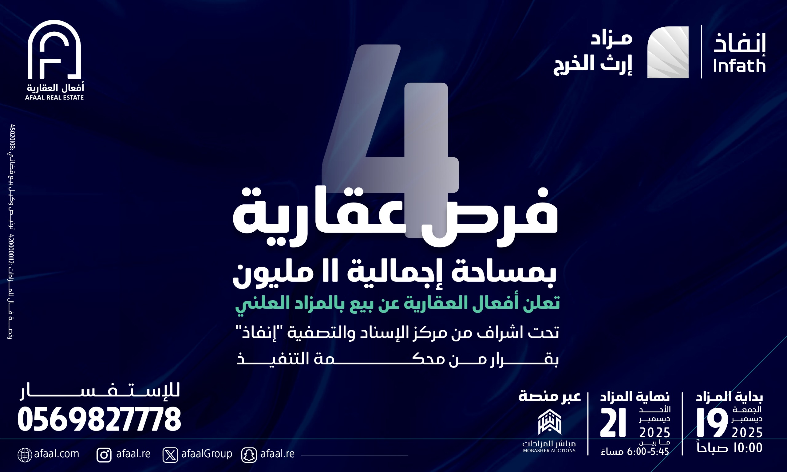 تعلن شركة أفعال العقارية وبإشراف مركز الإسناد والتصفية «إنفاذ» ، عن إقامة مزاد “إرث الخرج” إلكتروني وذلك يوم 19 / 12 / 2025 م ، إلكترونيًا عبر منصة مباشر للمزادات من الساعة 05:40 حتى 06:00.