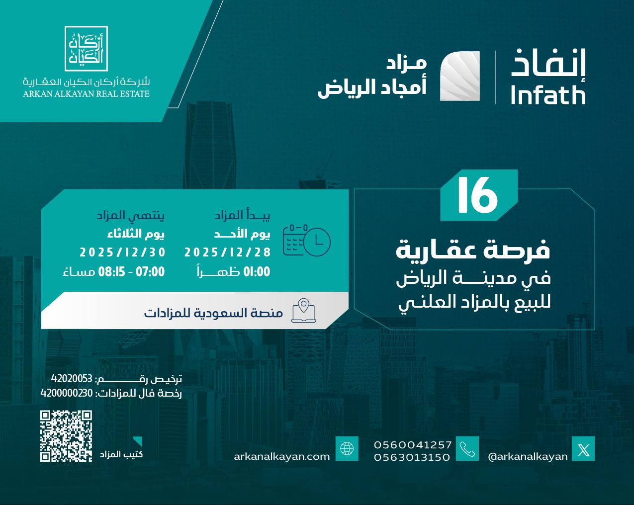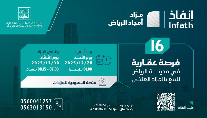 تعلن شركة أركان الكيان العقارية وبإشراف مركز الإسناد والتصفية «إنفاذ»، عن إقامة مزاد “أمجاد الرياض” الإلكتروني، يبدأ المزاد يوم الأحد بتاريخ 8 رجب 1447 ه الموافق 28 ديسمبر 2025 الساعة 1:00 م وينتهي يوم الثلاثاء بتاريخ 10 رجب 1447 ه الموافق 30 ديسمبر 2025 بين الساعة: 7:00 م والساعة 8:15 م إلكترونيًا عبر منصة السعودية للمزادات.