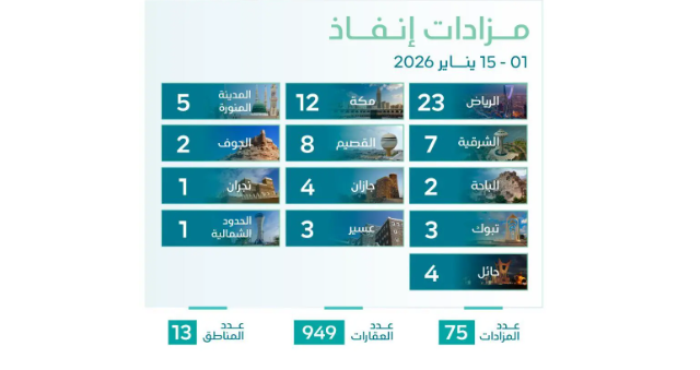 يستهل مركز الإسناد والتصفية (إنفاذ) عام 2026 بالإشراف على (75) مزادًا عقاريًا تُقام خلال الفترة من 1 إلى 15 يناير لبيع (949) أصلًا عقاريًا متنوعًا تشمل العقارات السكنية والتجارية والزراعية في مختلف مناطق المملكة.