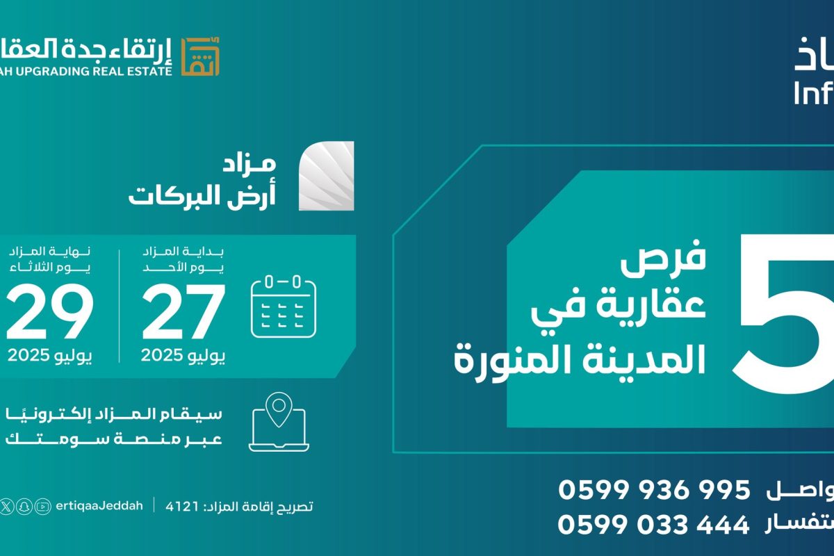 «إرتقاء جدة العقارية» تطرح 5 فرص عقارية في مزاد «أرض البركات» بالمدينة المنورة