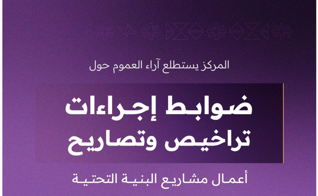 المركز يفتح منصة "استطلاع" لاستقبال آراء الجمهور والجهات حتى 8 أبريل حول إجراءات تراخيص مشاريع البنية التحتية.