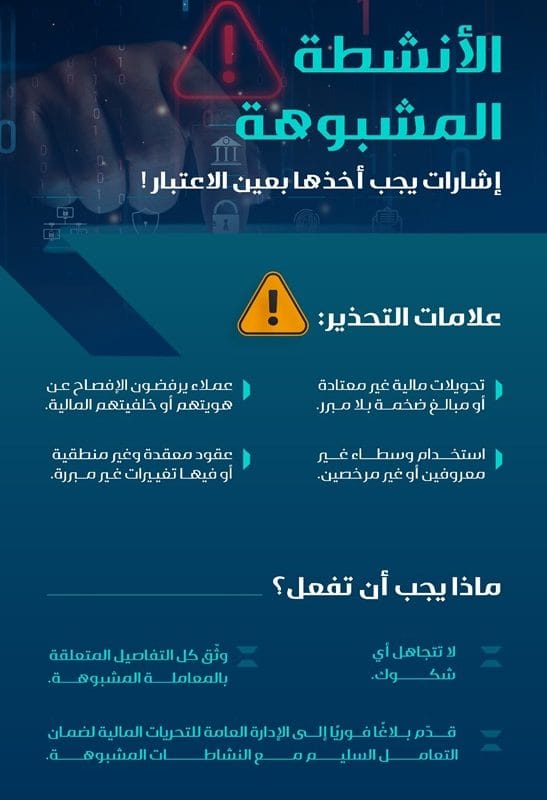 تحدد علامات تستدعي التدقيق وتدعو لتوثيق البلاغات لحماية الاقتصاد الوطني من الأموال المشبوهة