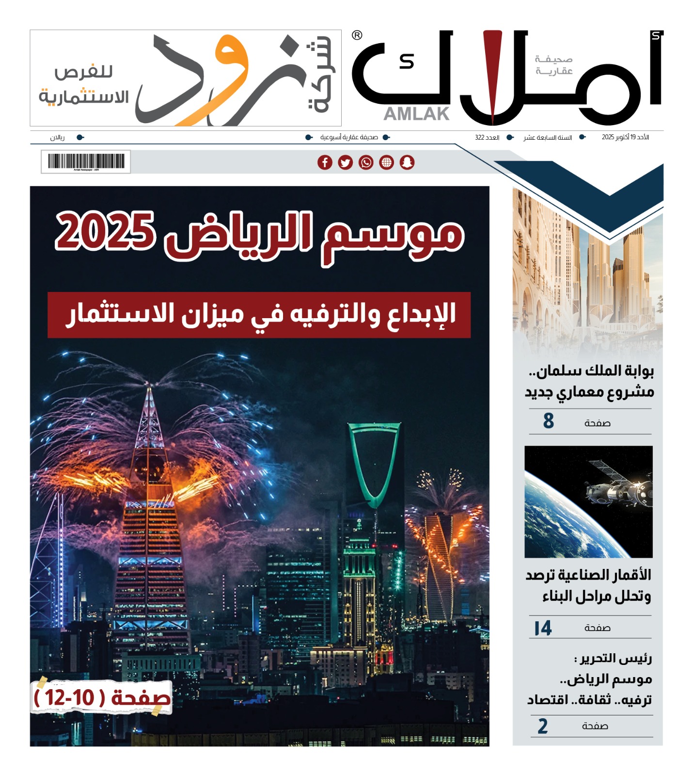 صدر العدد 322 من صحيفة أملاك العقارية ويحتوي على آخر مستجدات السوق العقاري والتغطيات والتقارير الموثوقة، وملف خاص عن موسم الرياض 2025، وتطالعون في العدد: