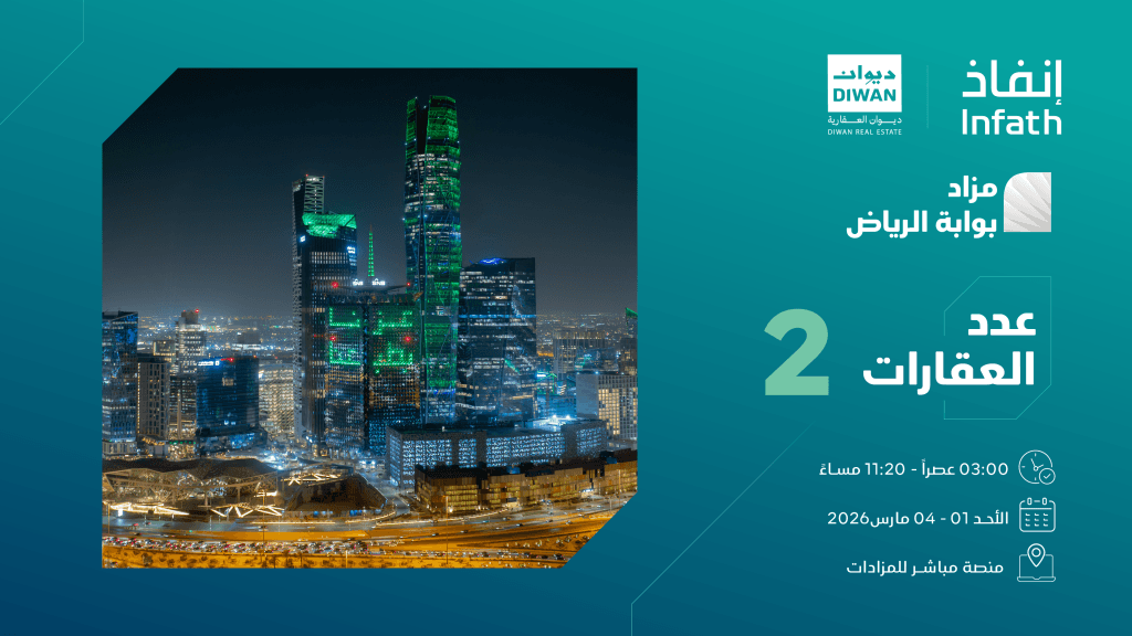 تعلن شركة ديوان العقارية وبإشراف مركز الإسناد والتصفية «إنفاذ»، عن إقامة مزاد «بوابة الرياض» الإلكتروني وذلك يوم 2026/03/01 الساعة: 03:00 إلكترونيًا عبر منصة مباشر للمزادات.
