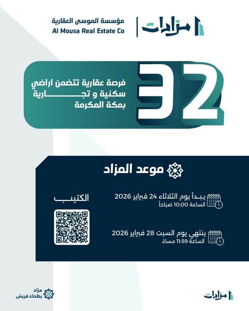 تعلن مؤسسة الموسى العقارية، عن إقامة مزاد «بطحاء قريش» الإلكتروني، يوم الثلاثاء 24 فبراير 2026 عند الساعة العاشرة 10:00 صباحًا، ويستمر حتى يوم السبت 28 فبراير 2026 عند الساعة 11:59 مساءً، وذلك عبر منصة السعودية للمزادات.