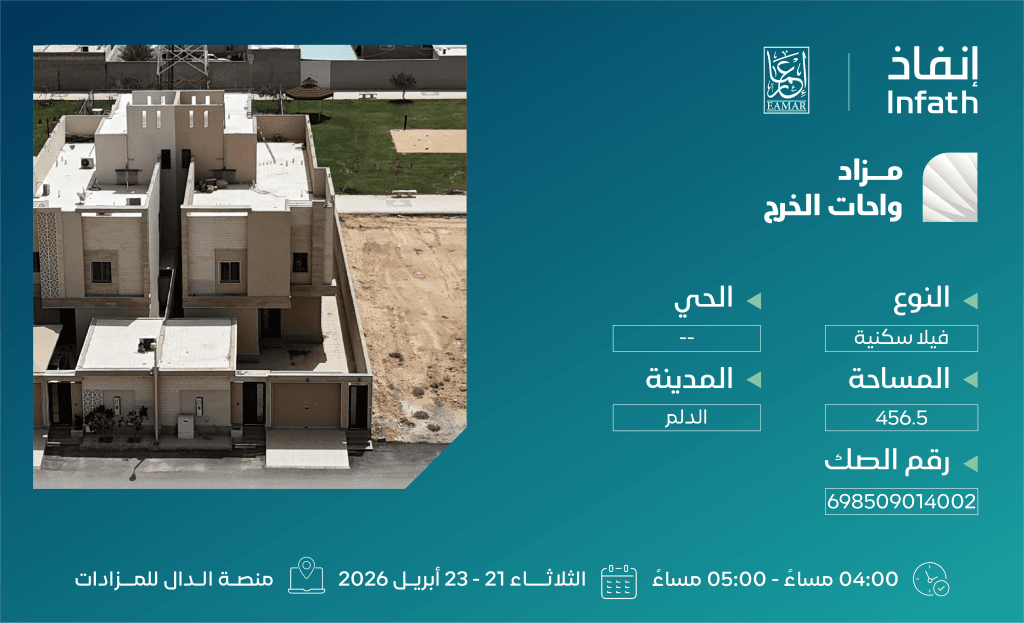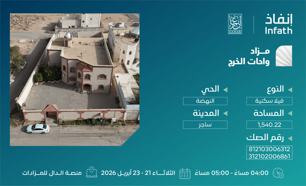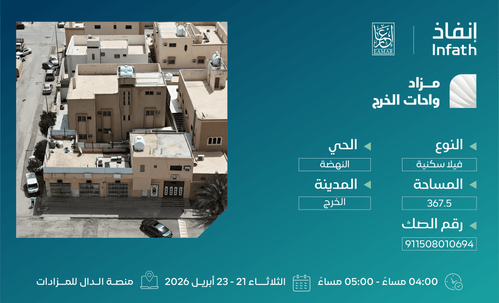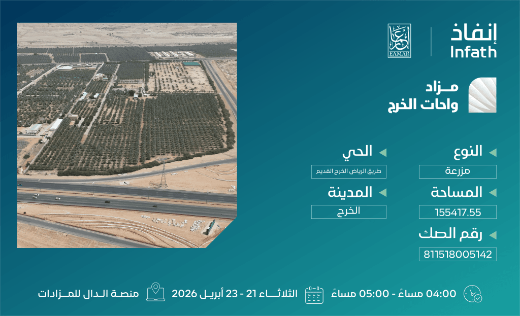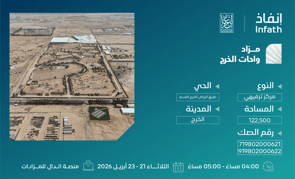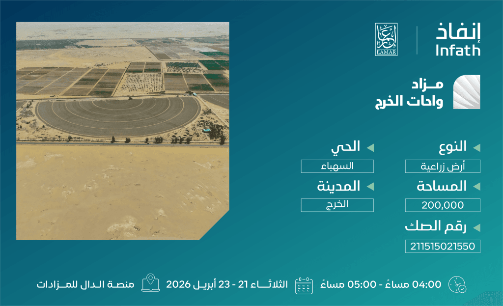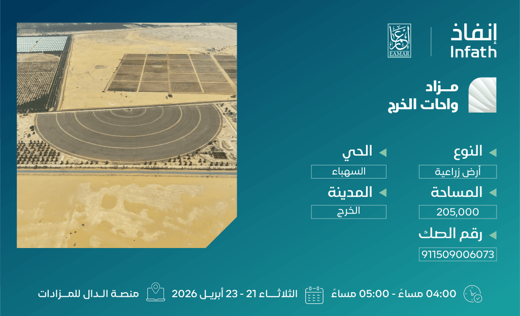 تعلن شركة إعمار للمزادات، وبإشراف مركز الإسناد والتصفية «إنفاذ» وبقرار من محكمة التنفيذ، عن إقامة مزاد «واحات الخرج» الإلكتروني، وذلك يوم الإثنين 21 / 4 / 2026 الساعة 10:00 صباحًا عبر منصة الدال، وينتهي يوم الخميس 23 /4/ 2026 ما بين الساعة 4:00 – 5:00 مساءً.