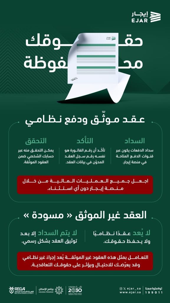 في المقابل، تحذر المنصة من التعامل مع العقود غير الموثقة، والتي تُعد بمثابة “مسودة”، حيث لا يُعتد بها نظاميًا ولا تحفظ الحقوق، كما لا يمكن إجراء السداد من خلالها إلا بعد توثيق العقد بشكل رسمي.