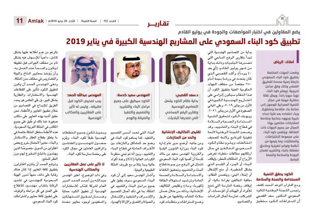 وفي ذات الموضوع, اعتبر المهندس عبدالله بن أحمد الحمد المدير العام لشركة كسّاب للاستشارات الهندسية أن تطبيق الكود حماية وضمان لحقوق المستهلكين والمستفيدين لوجود معايير محددة بالرغم من عدم اطلاعه عليها بشكل كامل, داعياً للإسهاب فيه بشكل تام من مختلف الجوانب قبل تطبيقه ليكون واضحاً عند العمل به, وأن يُؤخذ بمعايير المناخ والبيئة والتضاريس في مختلف مدن المملكة.