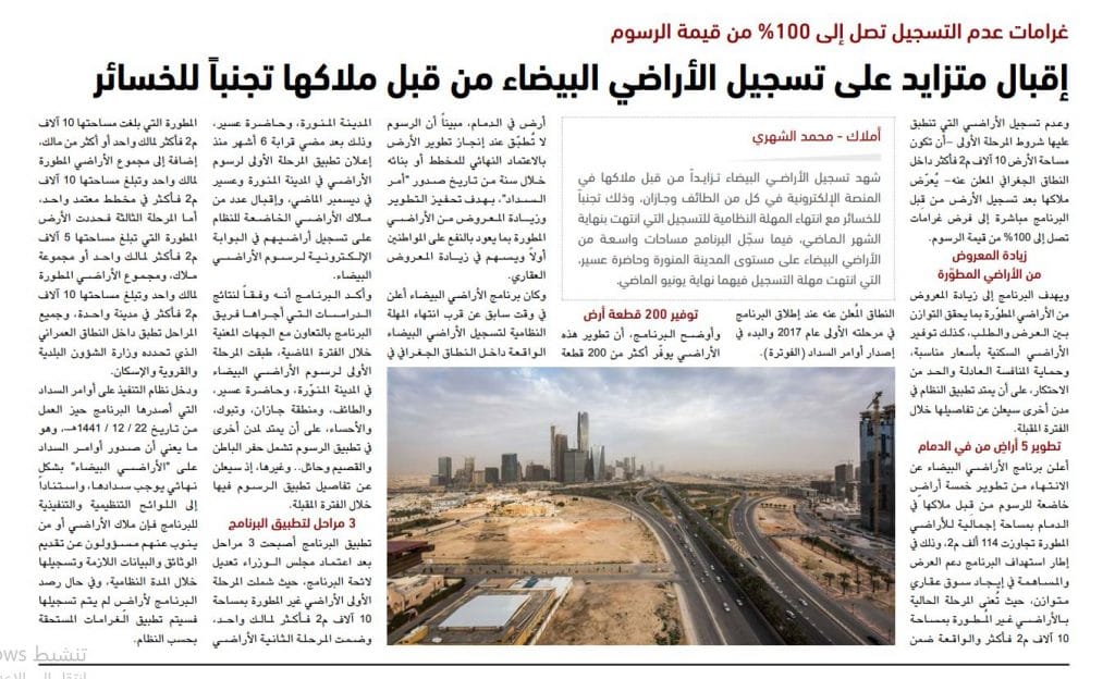 وكان برنامج الأراضي البيضاء أعلن في وقت سابق عن قرب انتهاء المهلة النظامية لتسجيل الأراضي البيضاء الواقعة داخل النطاق الجغرافي في المدينة المنورة، وحاضرة عسير، وذلك بعد مضي قرابة 6 أشهر منذ إعلان تطبيق المرحلة الأولى لرسوم الأراضي في المدينة المنورة وعسير في ديسمبر الماضي، وإقبال عدد من ملّاك الأراضي الخاضعة للنظام على تسجيل أراضيهم في البوابة الإلكترونية لرسوم الأراضي البيضاء.