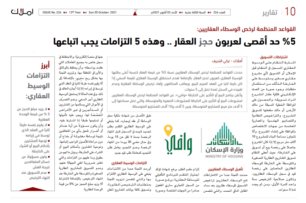 وأعلن برنامج البيع أو التأجير على الخارطة «وافي»، عن القواعد المنظمة لرخص الوسطاء العقاريين لمشروعات البيع أو التأجير على الخارطة للمشروعات الصغيرة والمتوسطة، والتي تصل مساحتها إلى 5 آلاف متر مربع للمشاريع المتوسطة، وبين 5 آلاف و10 آلاف للمشاريع المتوسطة.