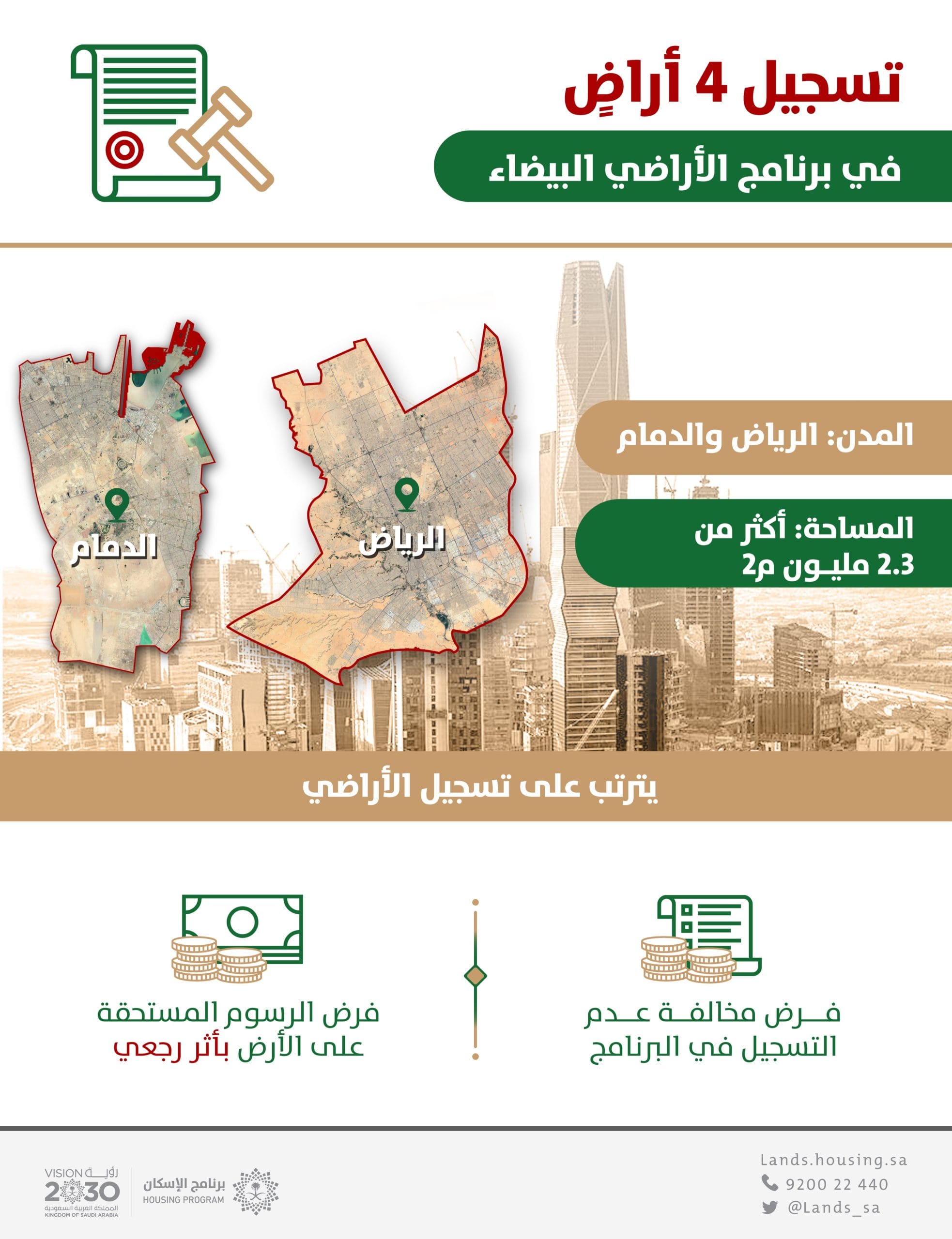 أعلن برنامج الأراضي البيضاء عن تسجيله 4 أراضِ في مدينة الرياض وحاضرة الدمام بمساحة إجمالية 2.3 مليون م2، بعد رصد عدم تسجيلها في النظام ضمن المرحلة الأولى التي تُعنى بالأراضي غير المطورة “الخام” بمساحة 10 آلاف متر مربع وأكثر، والواقعة ضمن النطاق المُعلن عنه في المدن التي طُبق النظام فيها.