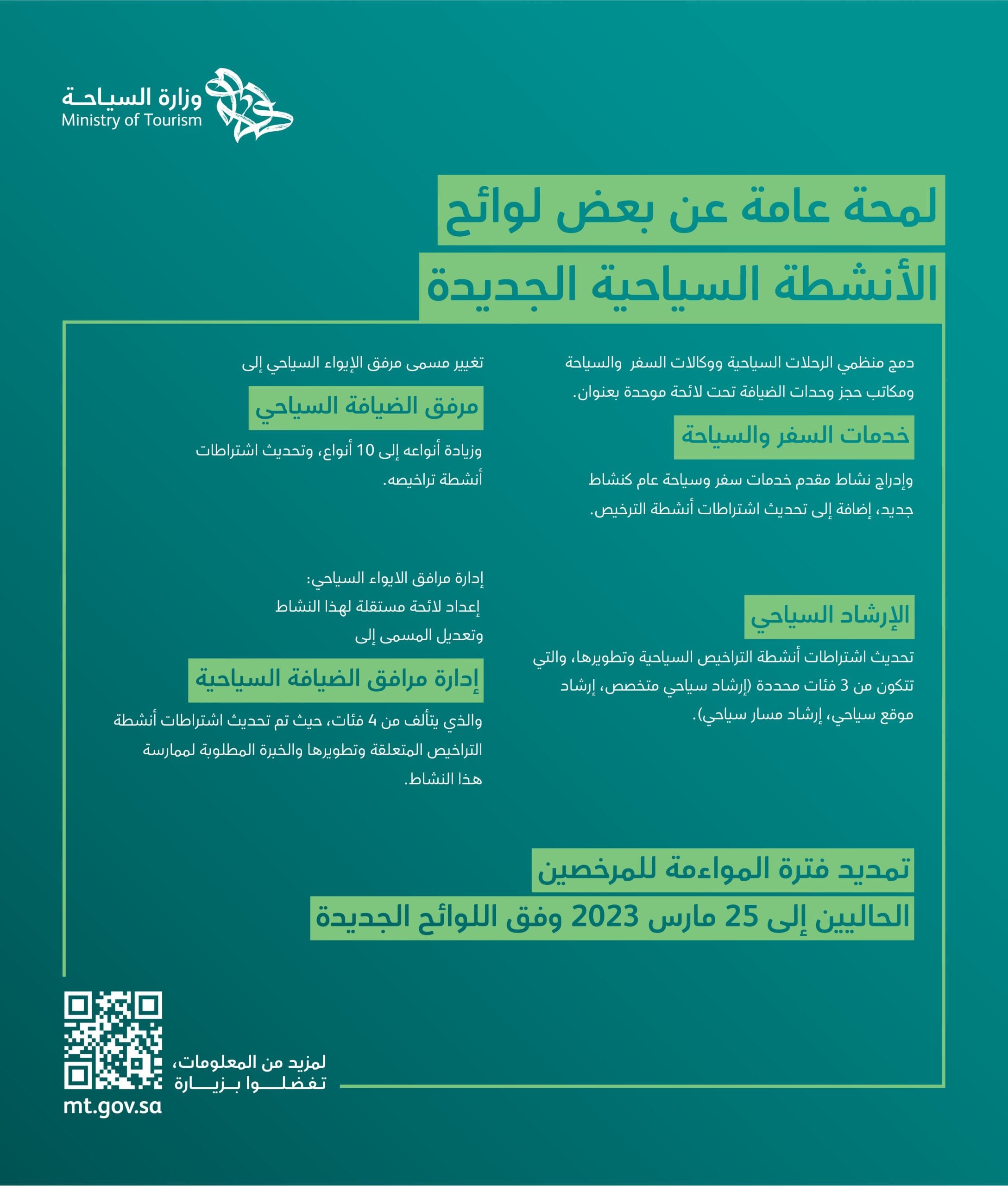 وحددت الوزارة مهلة 90 يوماً لتبدأ المنشآت في المواءمة مع اللوائح الجديدة وتعديل أوضاعهم وفقًا للاشتراطات والمعايير الجديدة، علما أن اللوائح متاحة على الموقع الرسمي للوزارة كما يمكن تقديم الاستفسارات من خلال قنواتها الرسمية بمنصات التواصل الاجتماعي ومراكز التواصل السياحي.